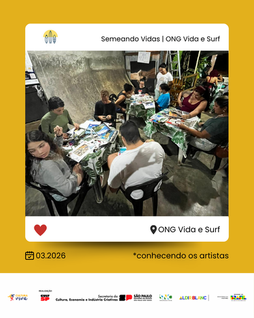São 2 encontros semanais aqui na Vida e Surf, durante o ano, abordando subtemas como Oficinas Criativas, Empreendedorismo, E-commerce e Sustentabilidade do Meio Ambiente. Valorizando a arte e os artistas locais. Bolsa-auxílio para os participantes, certificação e material incluso.